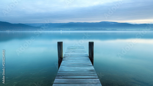 Obraz premium A serene wooden dock extending into a calm lake surrounded by mountains under...