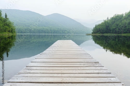 © Jiraphiphat, Fototapeta premium A serene wooden dock extends into a calm lake, surrounded by lush green hills and a misty atmosphere, creating a peaceful natural scene.