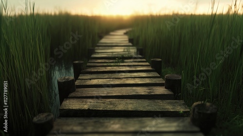 © kept, Obraz premium A serene wooden pathway leading through tall grass at sunset.