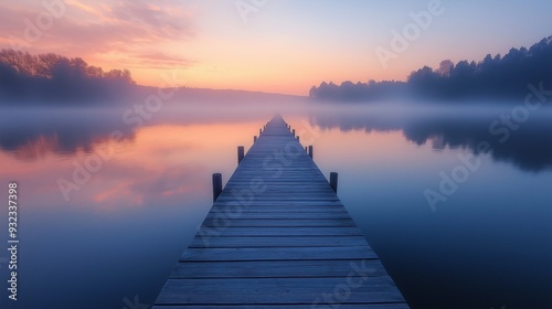 Naklejka premium A serene wooden pier extending into a misty lake during sunrise, symbolizing tranquility, reflection, and the journey of life with mindfulness through spirituality on a peaceful morning in nature