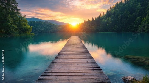 © Tanakorn, Fototapeta premium A serene wooden pier extending into a tranquil lake, illuminated by a stunning sunset and surrounded by lush greenery.