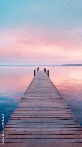 Fototapeta premium A serene wooden pier extending into a tranquil lake, under a pastel sunset sky, creating a tranquil atmosphere.copy space