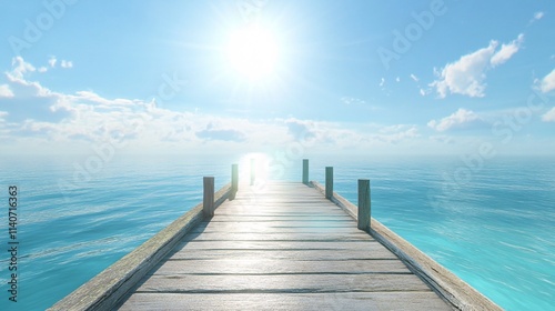 © Nathan, Fototapeta premium A serene wooden pier extends into a shimmering turquoise sea, illuminated by a bright sun overhead.