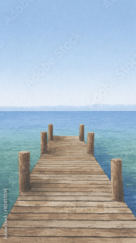 Fototapeta premium A Serene Wooden Pier Stretching Over Crystal Clear Waters Beneath a Calm Blue...