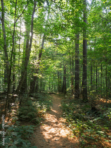 Obraz premium A serene woodland scene features sunlight streaming through tall trees. The soft earth path invites exploration, surrounded by lush greenery, ferns, and the calm atmosphere of early morning.
