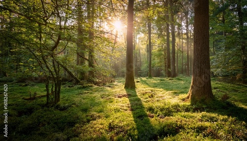 © Dorian, Naklejka premium a serene woodland scene with sunlight filtering through the branches casting a warm glow over a lush grassy floor