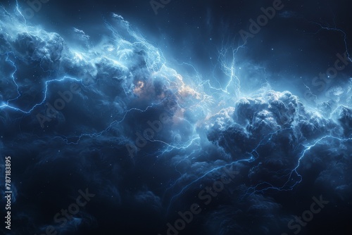 Fototapeta premium A serene yet powerful display of delicate lightning tracing through ethereal blue clouds in a cosmic dance