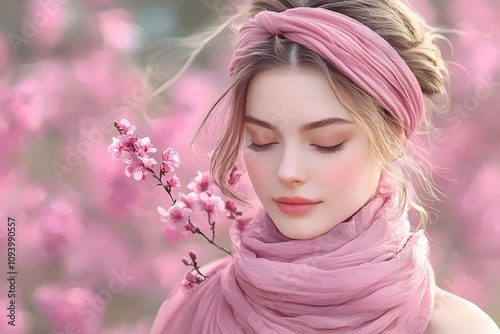 Fototapeta premium A serene young woman with fair skin and long blonde hair, wearing a pink headscarf and scarf, surrounded by blooming cherry blossoms in soft pastel shades.