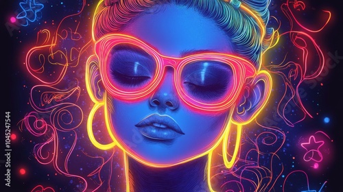Fototapeta premium A serene young woman with vibrant neon glasses, showcasing an artistic glow...