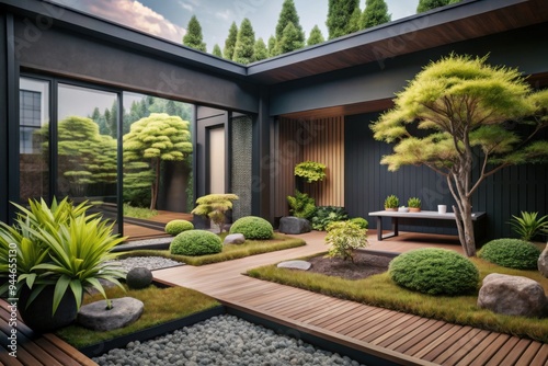 Naklejka premium A serene zen garden with lush greenery and wooden pathways creates a tranquil...