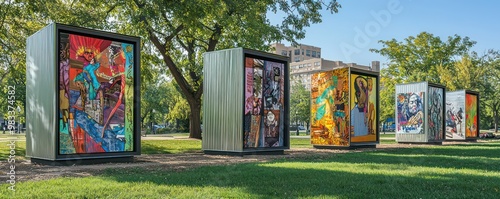 © Adnan saheem, Obraz premium A series of artist-designed aluminum siding installations in a city park, each reflecting different cultural themes and contributing to an outdoor gallery experience