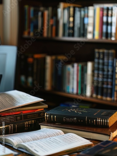 © Shutter2U, Fototapeta premium A series of books on financial markets, investment strategies, and economic theories on a desk