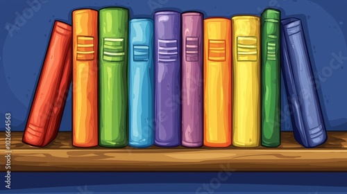 © typepng, Naklejka premium A series of colorful books sit atop a wooden shelf. Generative stock.