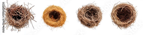 Obraz premium A series of four bird nests displayed in a row, showcasing varying textures...