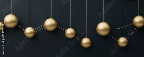Obraz premium A series of golden spheres suspended on strings against a dark background,...