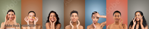 © Prostock-studio, Fototapeta premium A series of images features six diverse women applying various skin care products on their faces, against a backdrop of different colored walls. They are all showcasing their radiant skin.