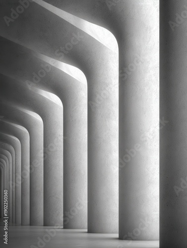 © Zaleman, Fototapeta premium A series of massive curved concrete pillars create a rhythmic architectural perspective in a minimalist monochrome setting with soft overhead lighting and deep shadows.