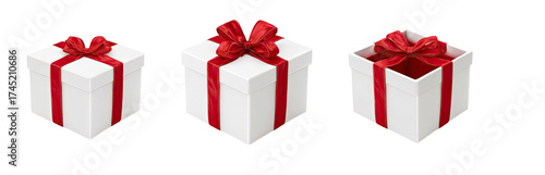 Obraz premium A series of three white square gift boxes with red ribbons, two closed and...