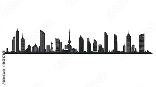© THUA, Fototapeta premium A series of urban skyline illustrations, flat silhouettes with diverse skyscrapers and buildings, minimalist on white.