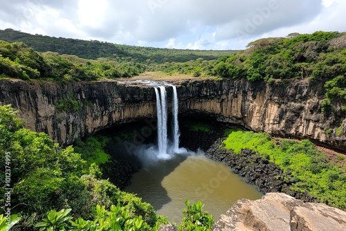 © Thanyarat, Fototapeta premium A series of waterfalls cascading down the cliffs of the Great Rift Valley, surrounded by lush vegetation and creating a stunning natural scene