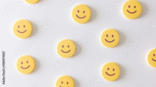 © Suphawan, Fototapeta premium A series of yellow smiley face stickers lined up diagonally on a white backdrop.