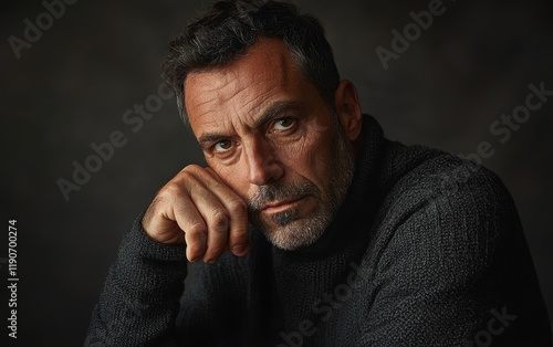 Fototapeta premium A serious man with a pensive expression on a dark gray background