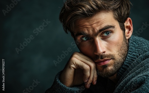 © Антон Федченко, Fototapeta premium A serious man with a pensive expression on a dark gray background