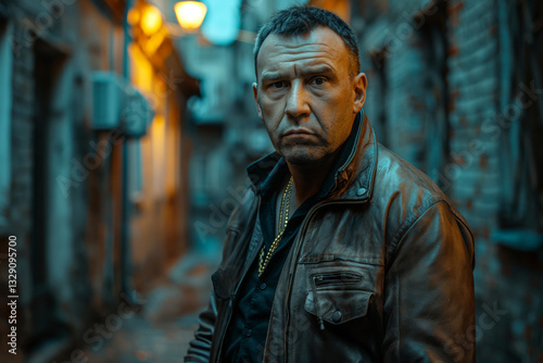 Naklejka premium A serious middle-aged man in a leather jacket stands in a dimly lit alleyway,...