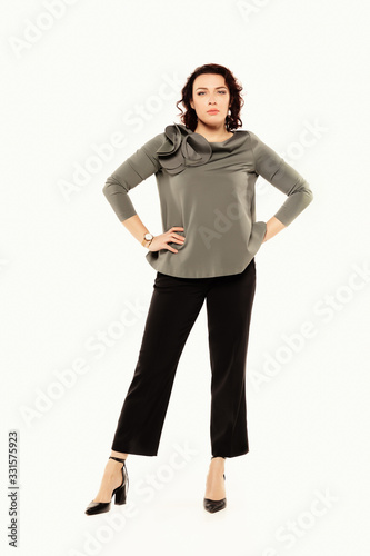 © deineka, Fototapeta premium A serious woman in a gray blouse holds her hands on her belt, isolated on white background.
