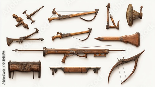 © Thidaphon, Obraz premium A set of antique European battle weapons, including crossbows and spears, arranged on a white background, hyper-detailed surfaces with intricate engravings, soft shadows