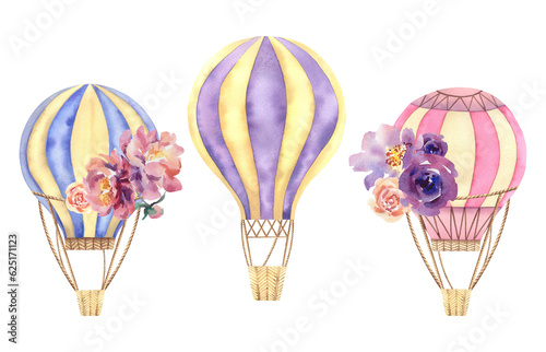 Fototapeta premium A set of balloons. Watercolor illustration on a white background. A journey...