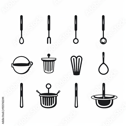 © Irinka Dimkovna, Fototapeta premium A set of black and white kitchen utensils on white background. The utensile set includes a slotted spoon, fork, ladle, serving spoon, two strainers, whisk, slotted turner, tea infuser, and colander.