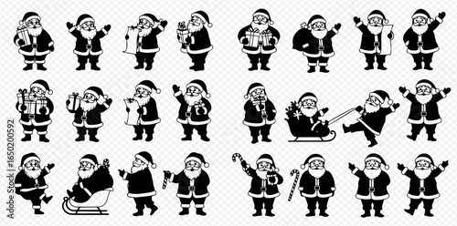 Naklejka premium A set of black and white Santa Claus character icons in various poses, such...