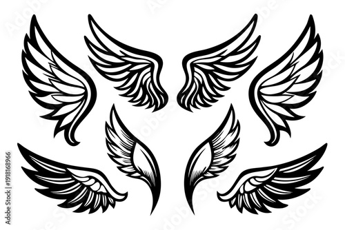 © MDSIRAZUL, Obraz premium A set of black and white wing illustrations in various styles and positions