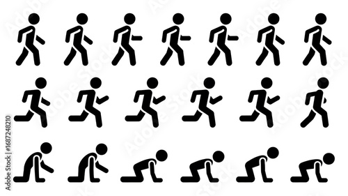 © MdSohel, Naklejka premium A set of 18 black stick figure illustrations arranged in three rows against a white background.