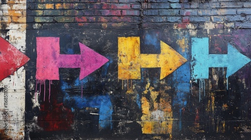 Fototapeta premium A set of bold, brightly colored arrow symbols painted on a grunge urban wall