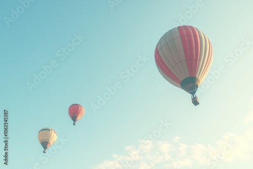 © Nico, Fototapeta premium A set of brightly colored hot air balloons rising into a clear sky.