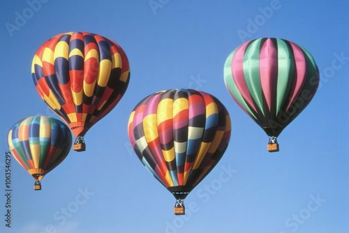 Fototapeta premium A set of brightly colored hot air balloons rising into a clear sky.