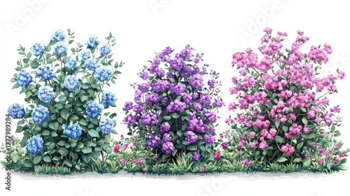 © Sabina Gahramanova, Naklejka premium A set of bushes with flowers in different shapes. A set of different types and sizes of bushes with flowers, greenery on a white background