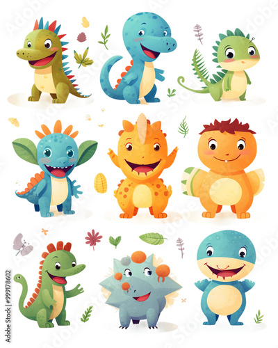© siriwan, Fototapeta premium A set of cartoon dinosaurs with different colors and expressions