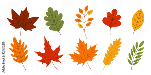 © MariiaMart, Obraz premium A set of colorful autumn leaves are drawn in various sizes and styles. The leaves are arranged in a row, with some overlapping and others standing alone. Scene is cheerful and vibrant