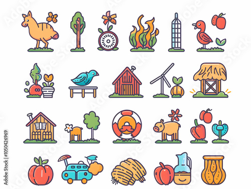 © Mang Ligan, Obraz premium A set of 24 colorful outline icons representing various farm animals, plants, fruits, vegetables, buildings, and other items related to farm life.