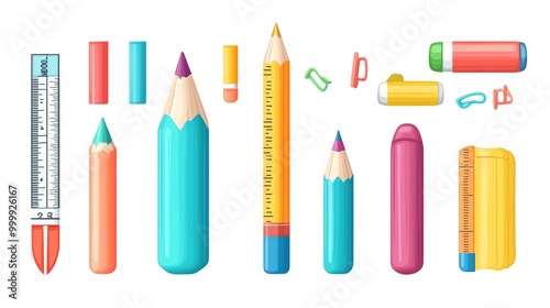 Obraz premium A set of colorful school supplies featuring a ruler, glue stick, and colored pencils, in flat style on a white background, Children s School Supplies, Fun and educational