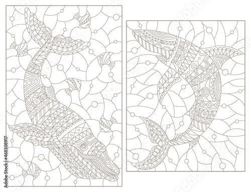 © Zagory, Fototapeta premium A set of contour illustrations in the style of stained glass with abstract shark and whale, dark contours on a white background