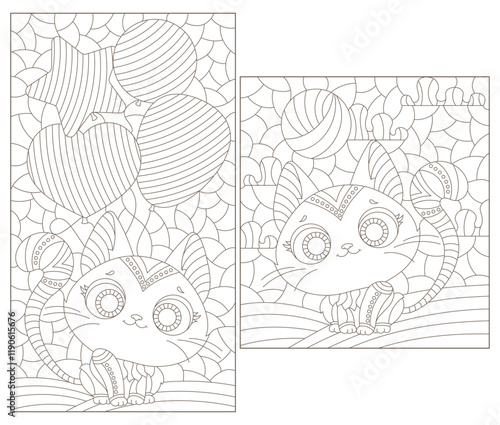 © Zagory, Fototapeta premium A set of contour illustrations in the style of stained glass with cute cartoon kittens, dark outlines on a white background