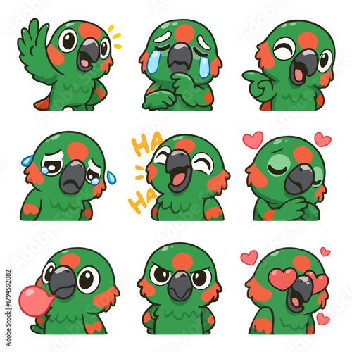 © hill, Fototapeta premium A set of cute anime parrots illustrations doing different activities with different expressions.Stickers or badges. Alexandrine Parakeet