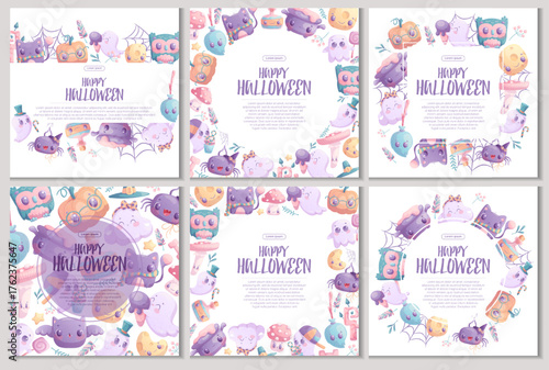 Fototapeta premium A set of cute backgrounds for Halloween invitations or greeting cards. Ghost, cat, pumpkin, bat, spider, fly agaric, potion, owl, cauldron for poster, flyer, postcard, banner. Vector illustration