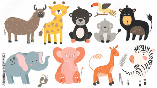 © ak159715, Naklejka premium A set of cute cartoon animals. Vector flat images of animals for postcards, invitations, textiles, thermal printing