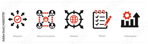 © popcornarts, Obraz premium A set of 5 Data analysis icons as research, secure connection, network