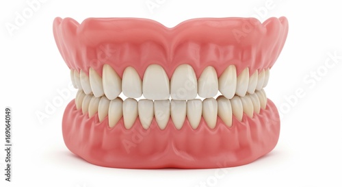 © Ahmed, Obraz premium A set of dentures with pink gums and white teeth displayed on a plain white background in a studio shot